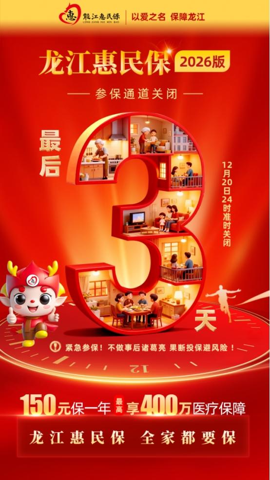“龍江惠民保2026版”參保通道將于2025年12月20日24時正式關(guān)閉,當前參保已進入最后3天倒計時。為方便廣大民眾全面了解這一惠民補充醫(yī)療保障政策、精準把握參保窗口期,相關(guān)部門對產(chǎn)品核心保障內(nèi)容及年度優(yōu)化亮點進行梳理說明。